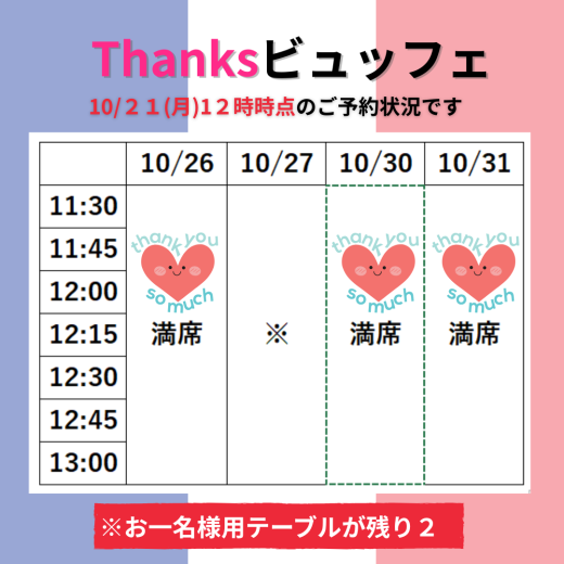 10月27日(月)にお一人様用のテーブルが2つございます。