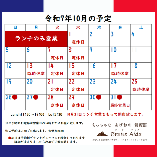 最後の営業月となりますが、10月もブレゼアイダをよろしくお願い致します。